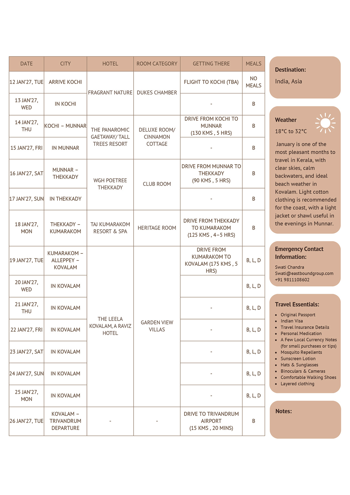 • Services of an accompanying English-speaking Escort from arrival in Kochi on 12 Jan’27 till Alleppey