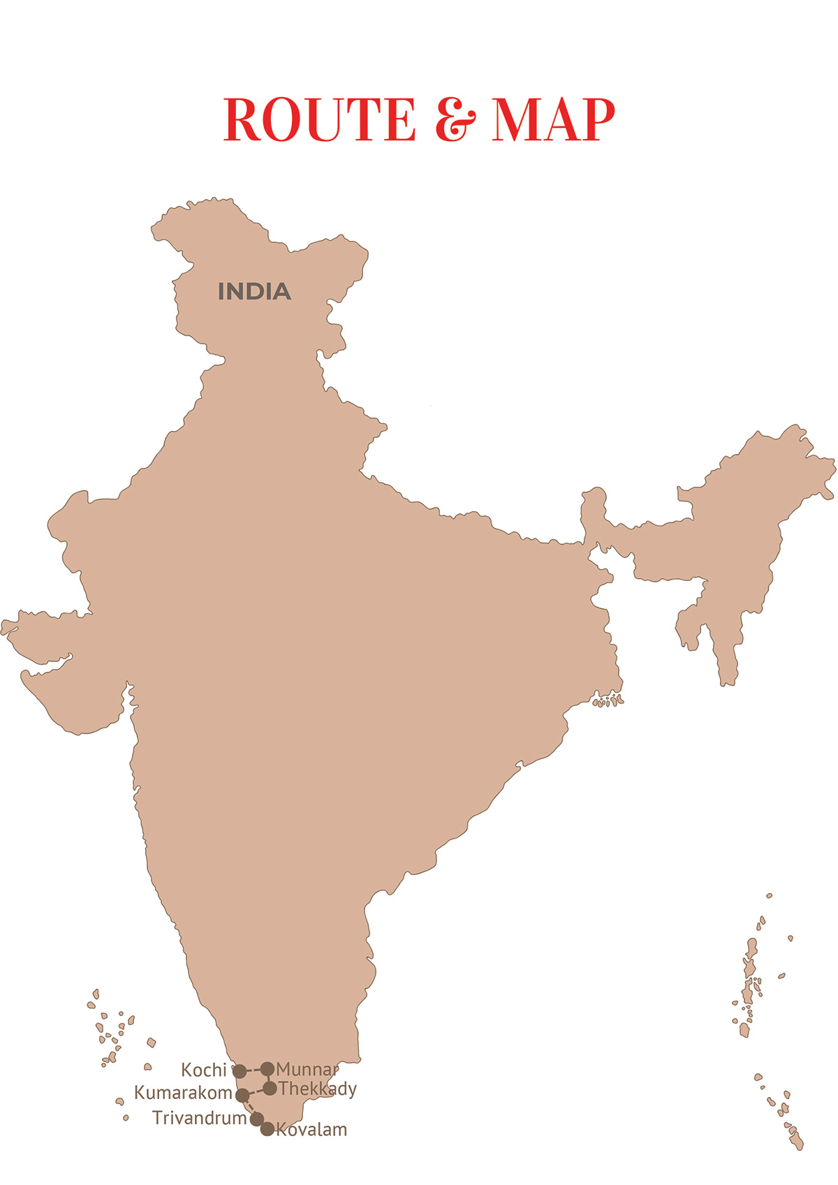 nd spice-laden trade routes shaped a unique coastal heritage. Travel onward to the mist-covered hills of Munnar and the wildlife-rich forests of Thekkady, before slowing down along the tranquil backwaters of Kumarakom with a traditional houseboat cruise. The experience concludes on the palm-fringed shores of Kovalam, where a structured Ayurvedic program, yoga, and treatments relaxation personalised provide and deep renewal. Combining heritage, nature, and holistic healing, this itinerary captures the diverse spirit of South India at an unhurried pace.